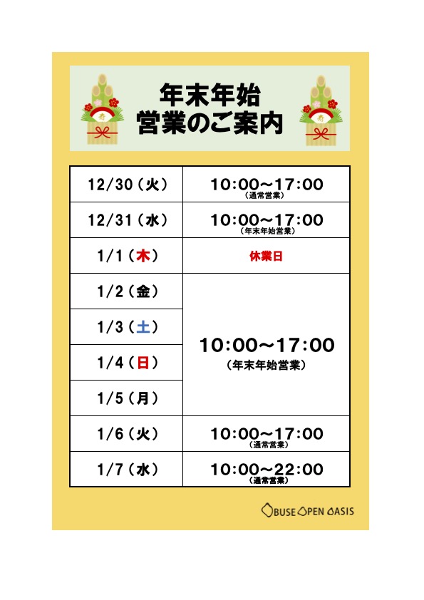 年末年始は元旦のみのお休みとなります。1月2日より営業いたしますのでぜひお越しください。