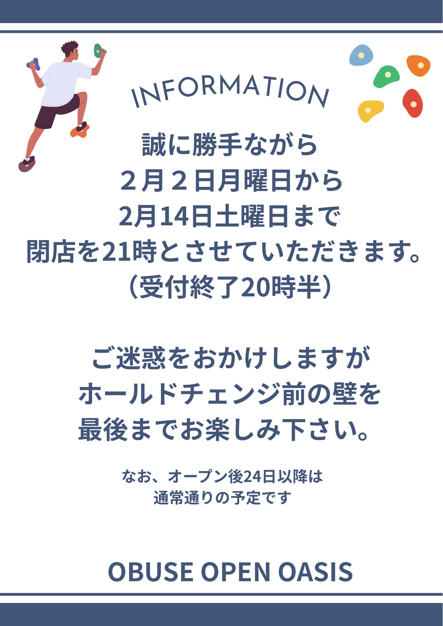 スタッフ不足の為、2月2日から2月14日まで
